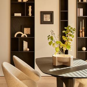 ТВ-зона в гостиной решена как архитектурный объект: комбинация дубовых фасадов сверху, тёмной ниши под телевизор, вертикальных реек и цоколя из того же камня, что и остров, — всё собрано в единую композицию. Рядом — встроенные стеллажи с чёрными открытыми нишами на контрасте со светлыми стенами: в них расставлены книги и декор, поддерживающие общее настроение.
