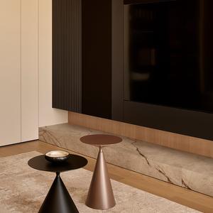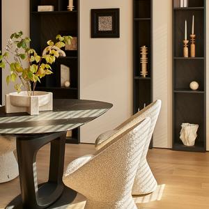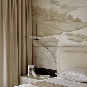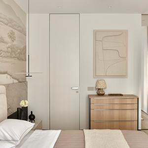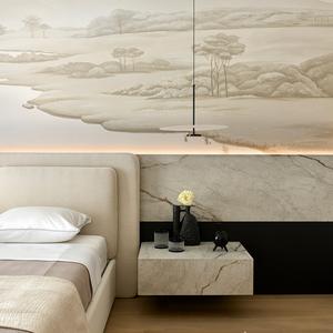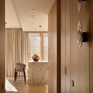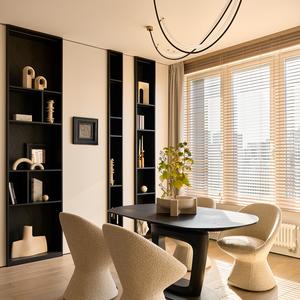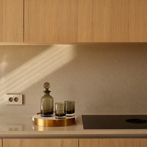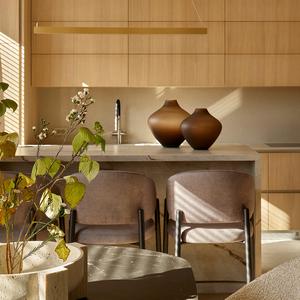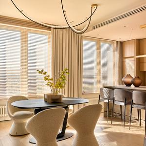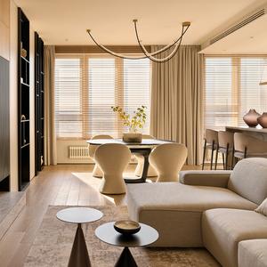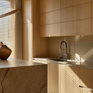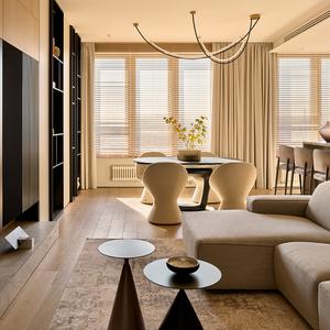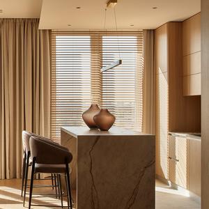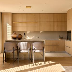 Основа визуального языка — светлый дуб в матовой отделке, тёплая бежевая палитра, графичные чёрные акценты и природный камень. Приглушённые оттенки и длинные горизонтали фасадов без ручек делают пространство визуально шире и спокойнее, а панорамные окна с деревянными жалюзи наполняют квартиру мягким рассеянным светом.