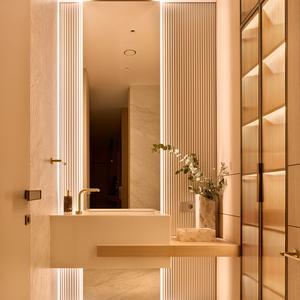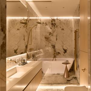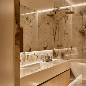 Ванная решена в тёплой палитре с камнем сложного рисунка, латунной сантехникой и скрытой подсветкой по периметру зеркал и пола. Тумба под раковину — наша работа: шпон светлого дуба, цельный фасад без ручек, встроенная в нишу «заподлицо» с облицовкой стен.