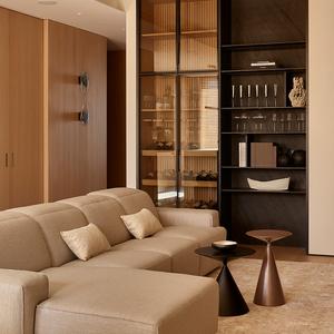 Отдельного внимания заслуживает витрина-бар: высокий шкаф с тонированным стеклом и латунными профилями, с подсветкой винной секции и полок для бокалов. Рядом — закрытые шпонированные фасады, которые скрывают бытовые системы хранения.