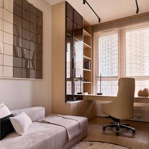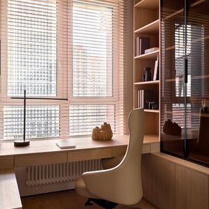 В проекте реализованы две рабочие зоны под разные сценарии. Первая — классический домашний кабинет со встроенным столом вдоль окна, длинной столешницей на всю ширину стены и высоким стеллажом с комбинацией открытых полок и витрин с тонированным стеклом. Всё в той же тёплой дубовой палитре — пространство для сосредоточенной работы с видом на город.