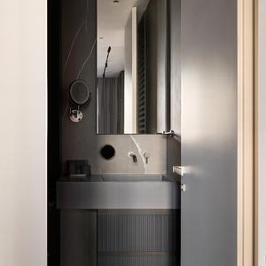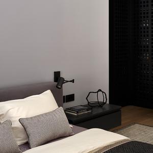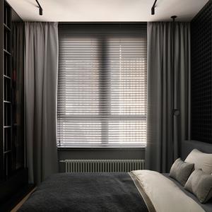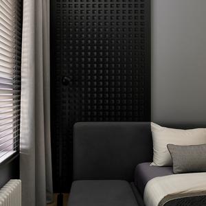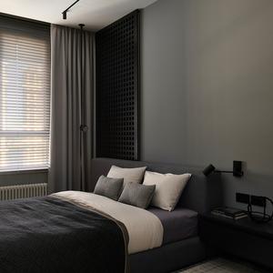 Спальня оформлена в глубокой графитовой палитре — намеренный контраст к светлой общей зоне. Мы сделали встроенный шкаф-стеллаж с тёмными открытыми нишами, декоративную перфорированную панель у изголовья и систему хранения, интегрированную в архитектуру комнаты. Получилось приватное, «обволакивающее» пространство для отдыха.