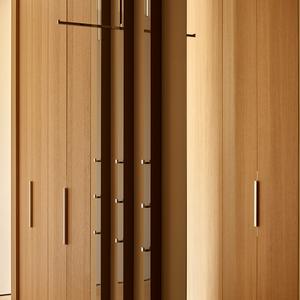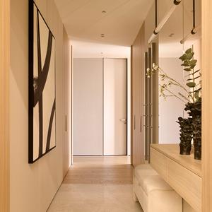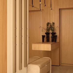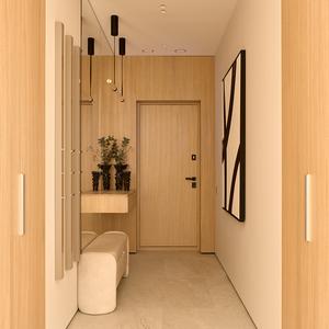 Входная зона задаёт тон всей квартире. Мы сделали встроенные гардеробные «заподлицо» со стенами — их фасады из светлого дуба читаются как цельные деревянные панели, без выступающих ручек и видимых стыков. Напротив — зеркальная стена во всю высоту с парящей консолью и мягкой банкеткой, что визуально удваивает пространство узкой прихожей и наполняет её светом.